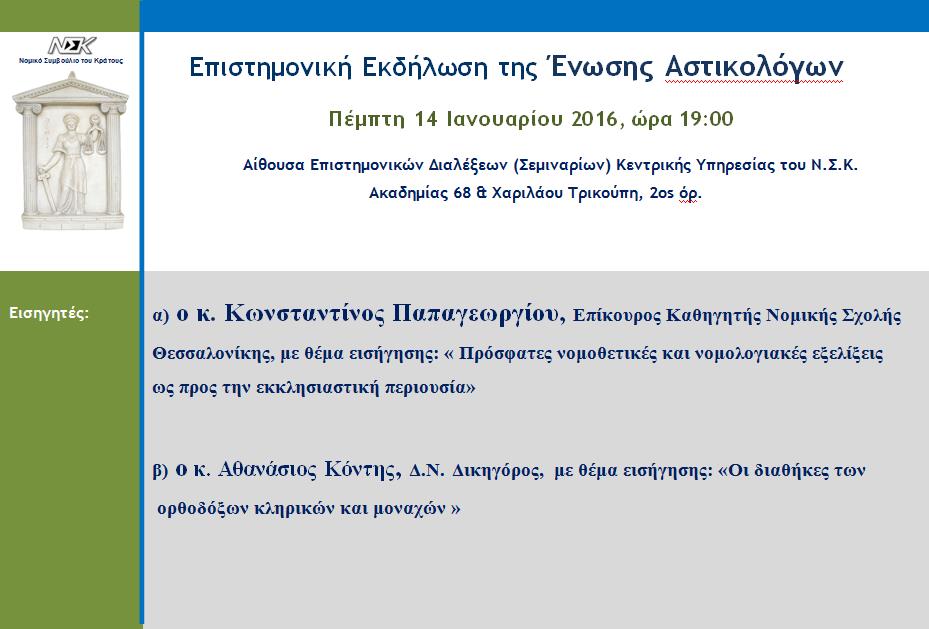 Την 14η Ιανουαρίου 2016, ημέρα Πέμπτη και ώρα 19:00 η Ένωση Αστικολόγων διοργανώνει επιστημονική εκδήλωση με εισηγητές τον κ. Κωνσταντίνο Παπαγεωργίου, επίκουρο καθηγητή Νομικής Σχολής Θεσσαλονίκης, με θέμα εισήγησης: «Πρόσφατες νομοθετικές και νομολογιακές εξελίξεις ως προς την εκκλησιαστική περιουσία» και τον κ. Αθανάσιο Κόντη, Δ.Ν. Δικηγόρο, με θέμα εισήγησης: «Οι διαθήκες των ορθοδόξων κληρικών και μοναχών».