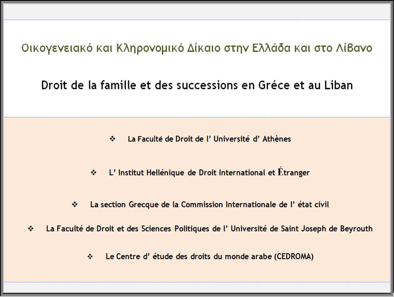 Την 27η Απριλίου 2015, ημέρα Δευτέρα και ώρα 10:00 με 20:00 η Νομική Σχολή του Πανεπιστημίου Αθηνών, το Ελληνικό Ινστιτούτο Διεθνούς και Αλλοδαπού Δικαίου, το Ελληνικό Τμήμα της Διεθνούς Επιτροπής Προσωπικής Καταστάσεως, η Σχολή Νομικών και Πολιτικών Επιστημών του Πανεπιστημίου Saint Joseph της Βηρυτού και το Κέντρο Μελέτης των Δικαίων του Αραβικού Κόσμου (CEDROMA) διοργανώνουν επιστημονική ημερίδα με θέμα "Οικογενειακό και Κληρονομικό Δίκαιο στην Ελλάδα και το Λίβανο - Droit de la famille et des successions en Grèce et au Liban".